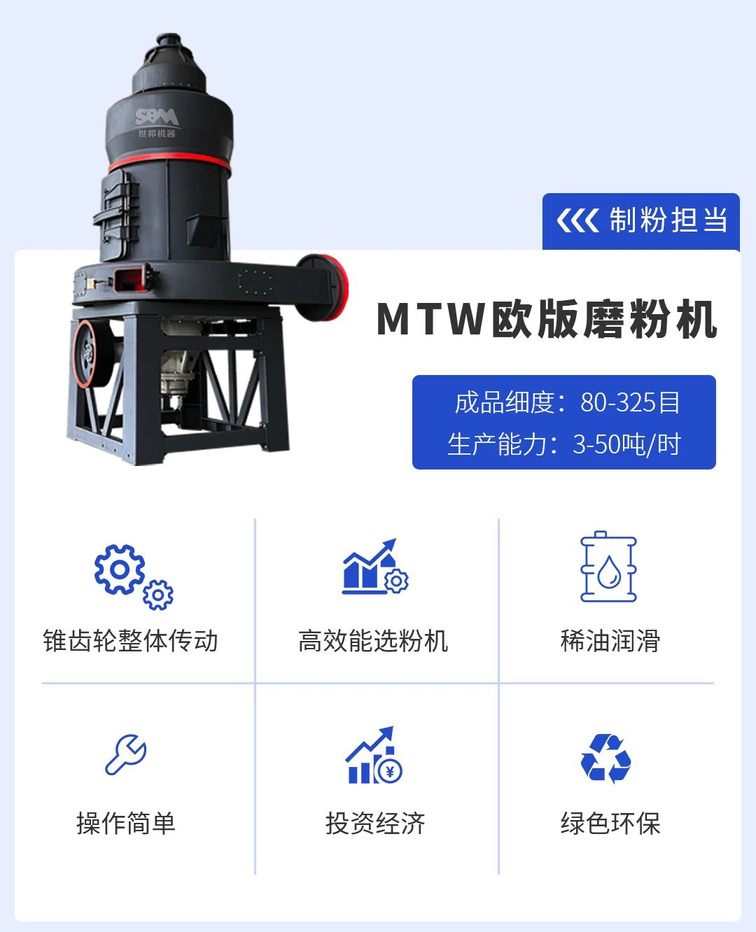 針對井陘石灰石高純度、質(zhì)地均勻的物料特性,以及客戶方對碳酸鈣在細度(325目)、白度、純度、粒度分布等方面的嚴(yán)苛要求,世邦選用深耕石灰石磨粉場景多年的MTW歐版磨粉機作為核心裝備,其多項技術(shù)優(yōu)勢精準(zhǔn)匹配高值化加工需求,為井陘石灰石打通“優(yōu)質(zhì)資源→高端產(chǎn)品”的轉(zhuǎn)化通道。